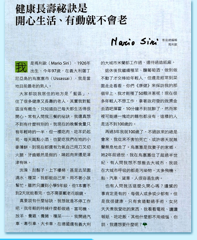 臺灣最暢銷的健康雜誌之一。以追求更美好的生命品質為目標,從內至外全面改善人們在身體、心靈及生活各方面需要,以達至最完美的人生。 內容涉及醫學科技的新發現、新觀念、新趨勢,到環境、食品營養、運動、人體衛生、生活習慣、人際關系的議題,內容豐富多彩。