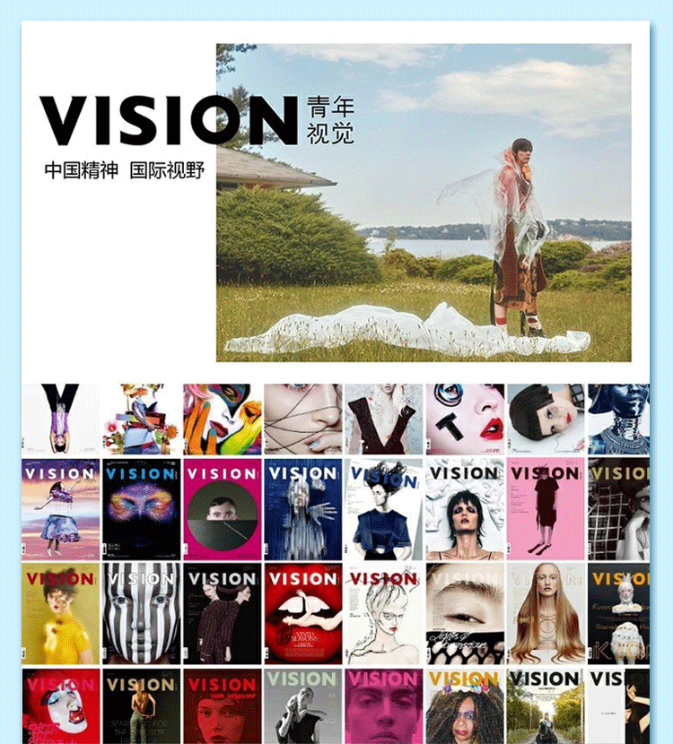 《青年視覺 VISION》創立于2001年,隸屬于共青團中央下轄的中國青年出版總社,至今已成立逾20年。刊物設立時尚、藝術、人文、設計四大內容版塊。不僅擁有來自各藝術、設計領域專業人士及藝術院校的忠實讀者,也受到熱愛生活美學、享受品質閱讀、有獨立見解讀者的喜愛。同時堅持“中國精神,國際視野”的宗旨,堅持挖掘本土原創內容,建立國內外藝術、設計、文化的溝通語境,堅持打造屬于中國青年人自己的文化美學平臺。