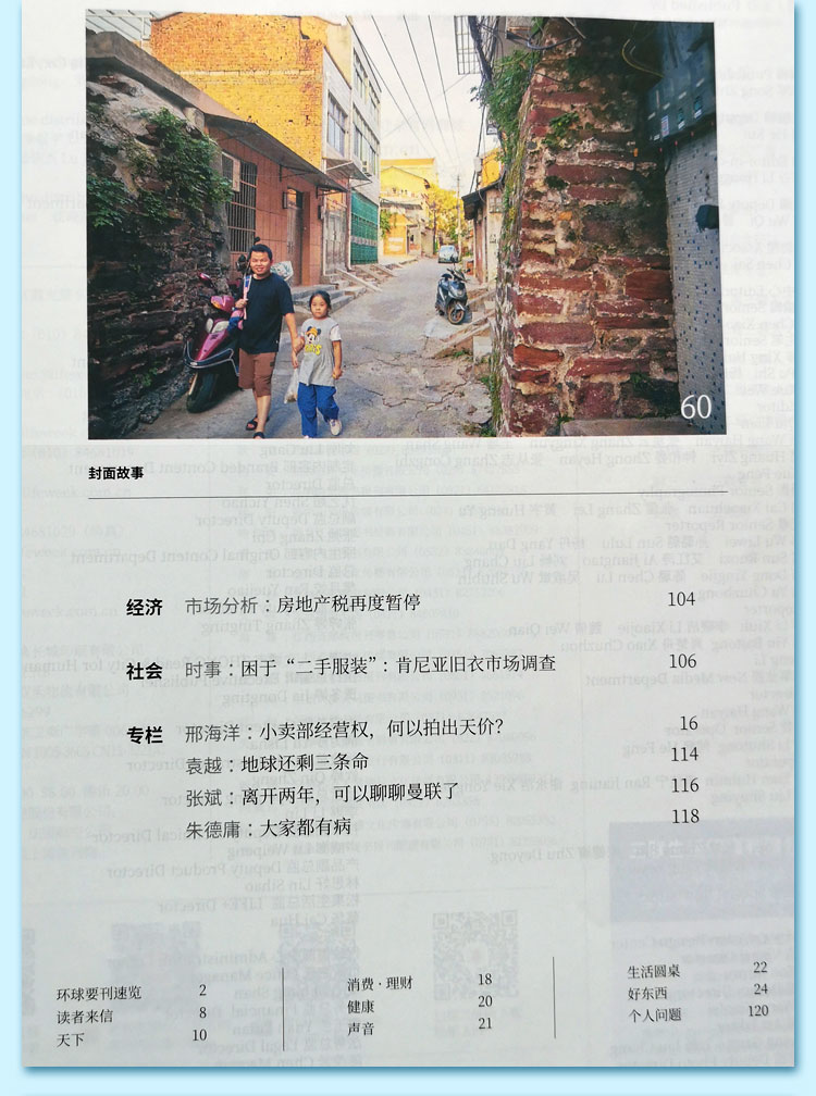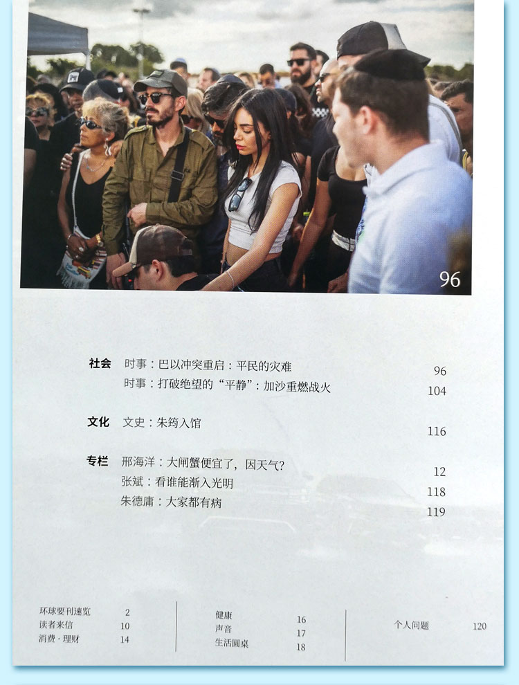 除封面故事、獨家的社會、財經、文化深度報道外,另設一周時事、社會、財經、文化專欄及環球要刊速覽、讀者來信、生活圓桌、聲音等特色欄目。