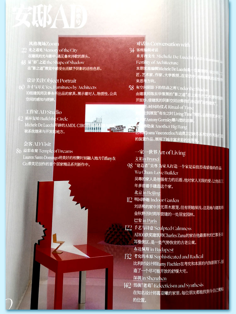《AD》,1920年創刊于美國,是國際上享有盛譽的有關家與生活方式的權威級刊物,目前在全球擁有美國、意大利、德國、法國、墨西哥、俄羅斯和西班牙共七個版本;并連續6年(2003-2008)被業內意見領袖評為 “最佳生活方式類雜志”(Lead-Award)。