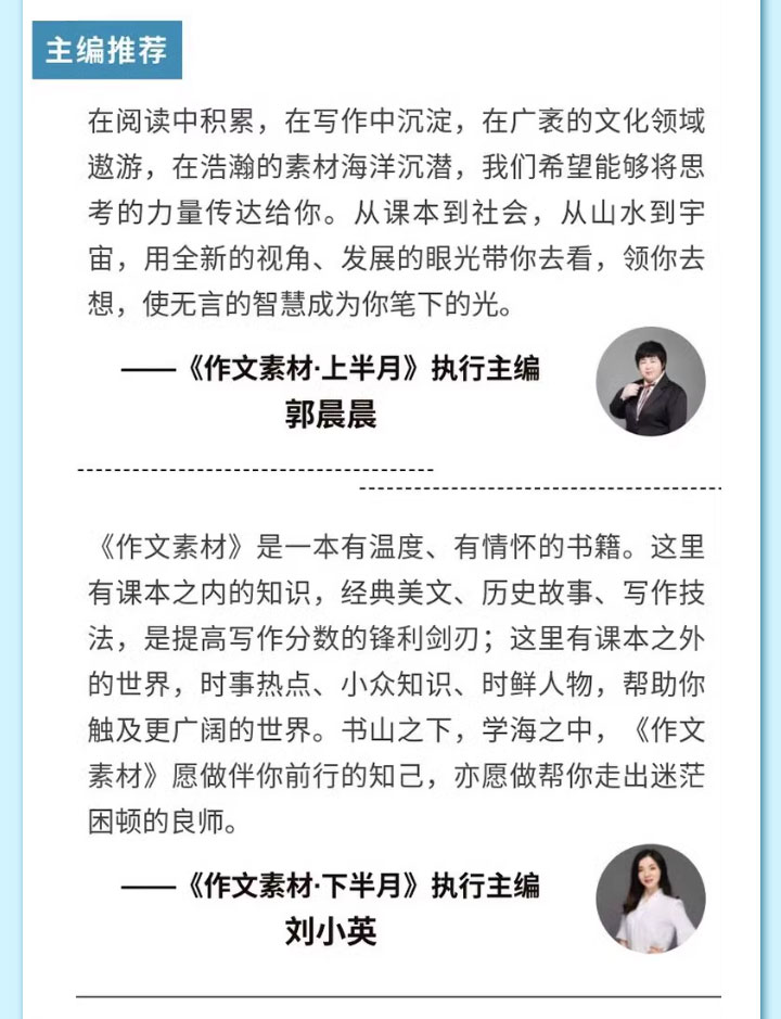 素材,就是別人的故事,別人的人生。把別人的故事寫進(jìn)你的故事,成就你自己的故事;把別人的人生納入你的筆端,成就你自己的人生,這就是《作文素材》的魅力。