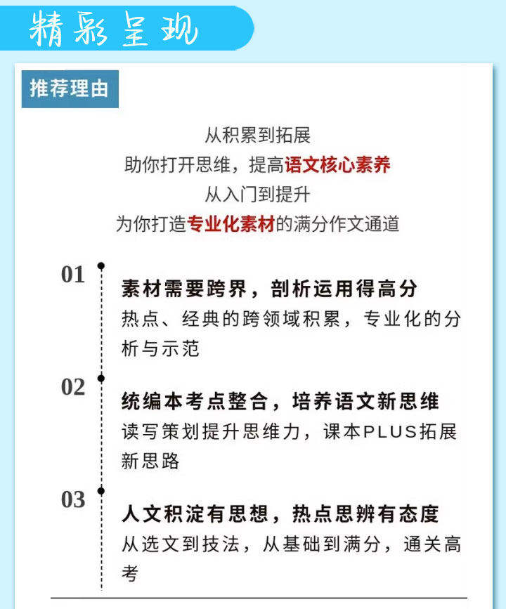 3000閱卷名師為你定制的高分作文直達(dá)通道——培養(yǎng)語(yǔ)文核心素養(yǎng),專注語(yǔ)文積累。積累的不只是是素材,更有思想;亮出來(lái)的不只是別人的觀點(diǎn),更有自己的態(tài)度;眾所周知的不一定是好素材,小眾思維讀寫決勝搶分;技法不一定穿上華麗的外衣,好學(xué)好用才能戰(zhàn)無(wú)不勝。
