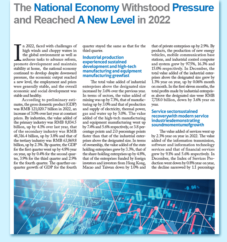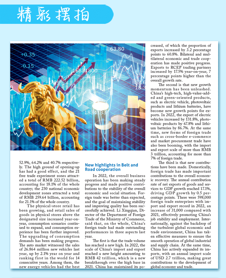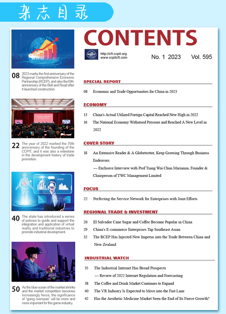 《China’s Foreign Trade》致力于向世界報(bào)道中國(guó)的經(jīng)濟(jì)發(fā)展動(dòng)態(tài)和趨勢(shì);關(guān)注行業(yè)發(fā)展,介紹中國(guó)的經(jīng)濟(jì)法規(guī)政策、投資環(huán)境、貿(mào)易機(jī)會(huì)與投資合作項(xiàng)目;介紹世界各國(guó)在中國(guó)及中國(guó)在世界各國(guó)的經(jīng)貿(mào)機(jī)構(gòu)、公司和企業(yè);介紹中國(guó)的出口商品及服務(wù)。