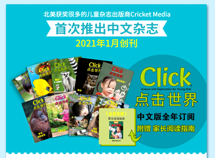《點擊世界Click中文版》每一期《點擊世界》的內容都和當期英文版雜志保持高度步調一致,因此所有內容都是新鮮出爐的,而不是過刊文章的重新排列組合。依托Cricket Media強大高效的編輯制作團隊,其在每一期的出版時間上也與英文版保持相同,當月一起推出。
