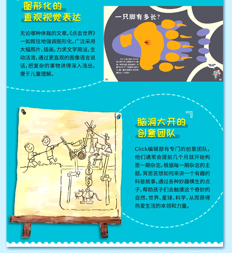 《點擊世界Click中文版》與英文版一樣,《點擊世界》也會提供完善的配套服務,有音頻、支持點讀、有講解(《家長閱讀指南》)。這本活潑的科普雜志,其《家長閱讀指南》也將根據每一期的主題,聚焦在科學知識普及、科學思維啟蒙方面,還將提供講解與練習、游戲與互動。閱讀、思考、實踐、動手,一本薄薄的雜志,足夠撐起孩子心中的一個小實驗室。