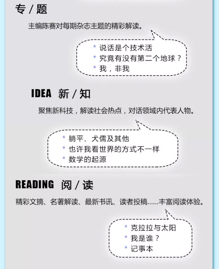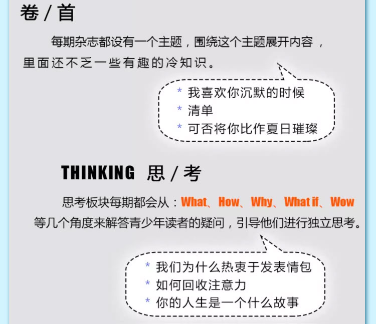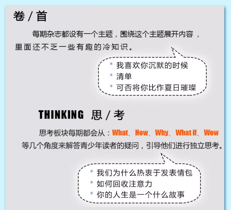 《少年新知》是一本針對9-16歲青少年進行人文思維啟蒙的原創雜志。對于青少年來說,思維能力遠比知識更重要,更能影響他們未來的人生道路。每期除精選的封面主題外,更有科學、文化、人物、思想游戲等專欄,眾多教育領域專家撰寫專欄,保證文章的質量和可讀性。希望通過閱讀來引導孩子們面對真實的世界,學習批判性思考,學習探索自我,學>如何與朋友相處,世界相處,學習探究人生的意義。