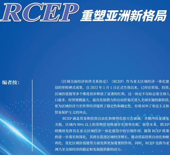 作為亞太區域經濟一體化建設的里程碑式成果,《區 域全面經濟伙伴關系協定》(RCEP)是區域國家共享發展 機遇的生動范例。兩年多來,區域貿易成本大幅降低,產